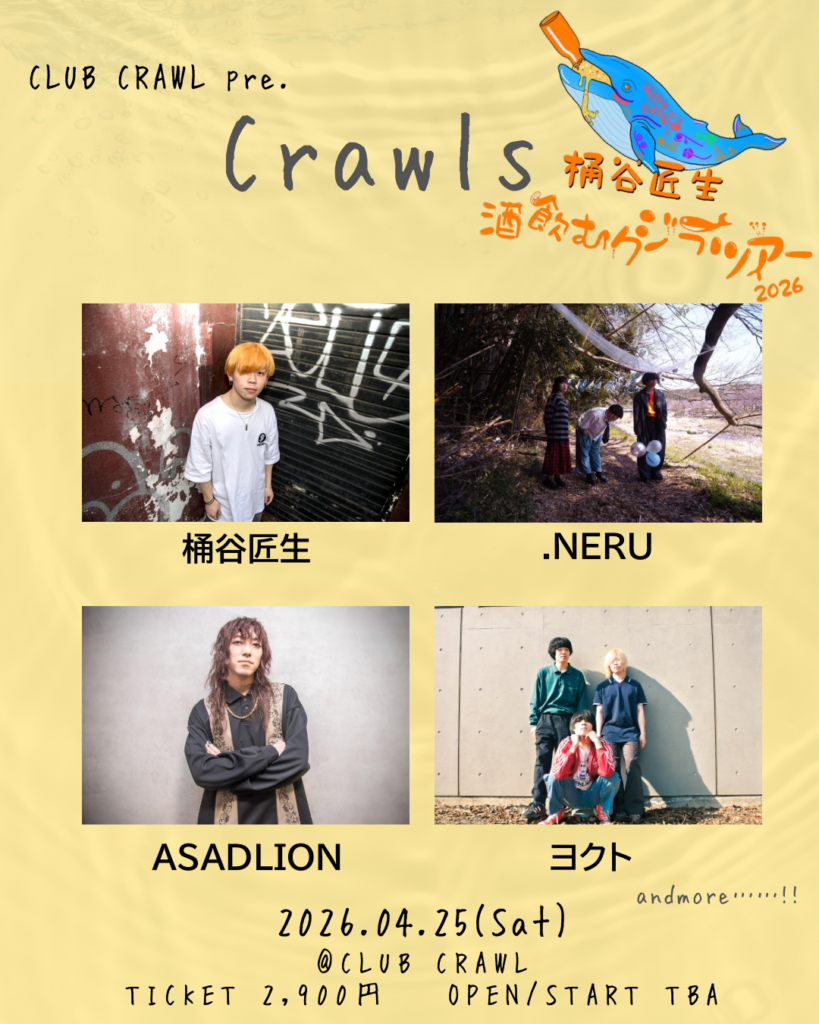 Home › LIVE › 2026.04.25(土)東京渋谷CRAWL 2026-03-13 2026.04.25(土)東京渋谷CRAWL 「Crawls」 開場–:–開演–:–料金¥2,900(+1D) 出演:・桶谷匠生 / .NERU / 路地猫徘徊 / ASADLION アーティスト予約はコチラ 関連記事 2026.04.27(月)東京下北沢Flowers loft※弾き語り 2026.06.11(木)東京渋谷CYCLONE【主催】 2026.05.29(金)東京神楽坂天窓※Vo.弾き語り 2026.04.21(火)東京青山RizM【L-1グランプリ】 2026.06.05(金)東京池袋Livehouse mono※Vo.弾き語り 2026.04.27(月)東京下北沢Flowers loft※弾き語り 2026.04.21(火)東京青山RizM【L-1グランプリ】